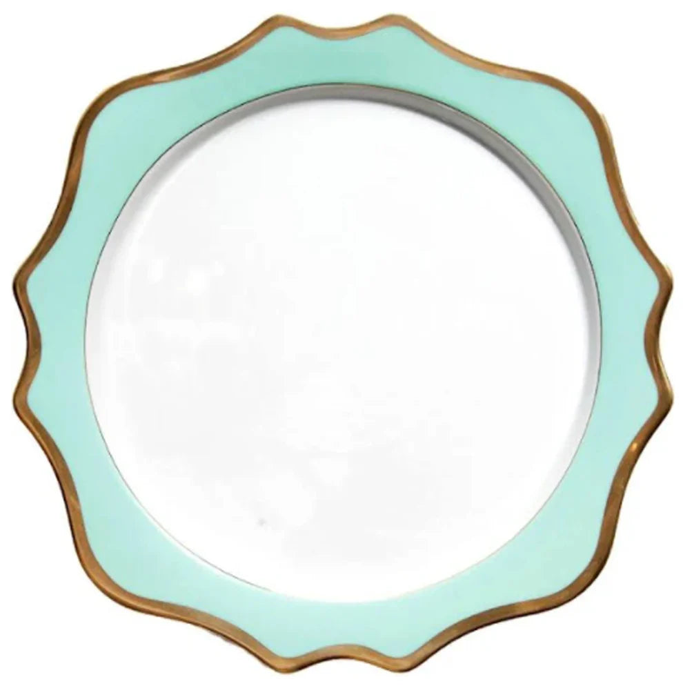 Add a touch of elegance to your dining experience with Anna's Palette, antique shaped dinnerware. Crafted from porcelain in a stunning aqua green hue, this dinnerware features a delicate scalloped gold edge for a sophisticated touch. Mix and match to create a unique and stylish table setting.