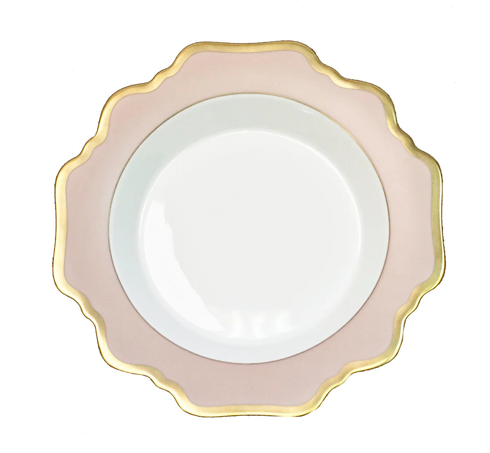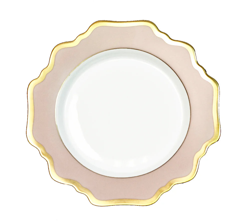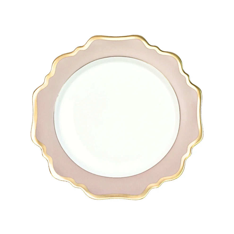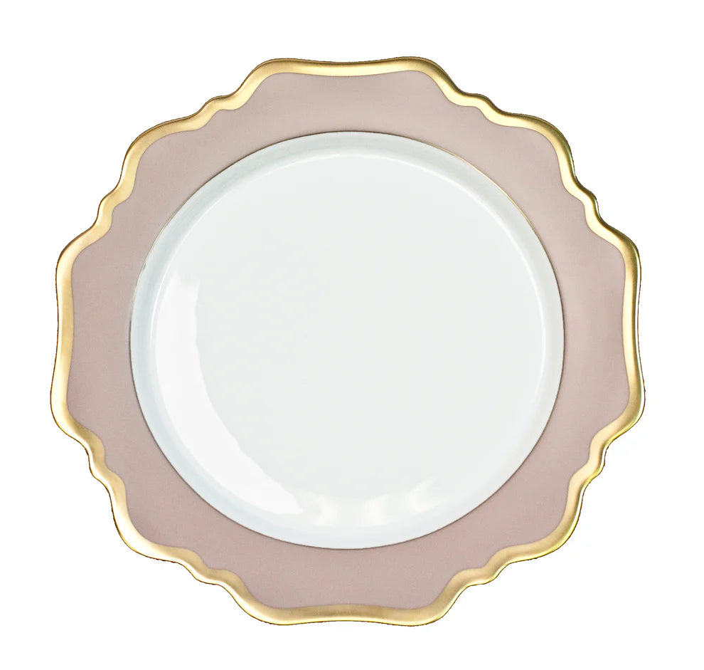 Add a touch of elegance to your dining experience with Anna's Palette, antique shaped dinnerware. Crafted from porcelain in a stunning dusty rose hue, this dinnerware features a delicate scalloped gold edge for a sophisticated touch. Mix and match to create a unique and stylish table setting.