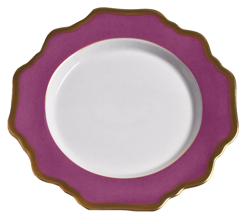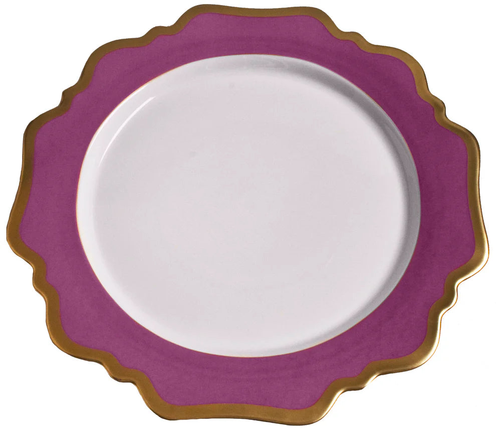 Add a touch of elegance to your dining experience with Anna's Palette, antique shaped dinnerware. Crafted from porcelain in a stunning purple orchid hue, this dinnerware features a delicate scalloped gold edge for a sophisticated touch. Mix and match to create a unique and stylish table setting.