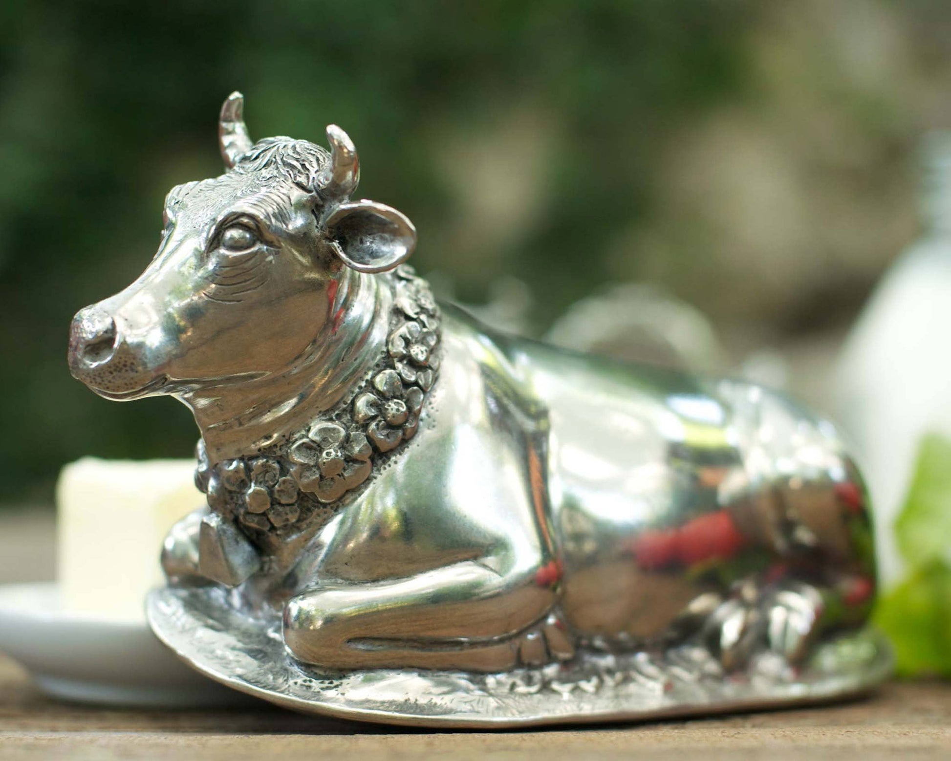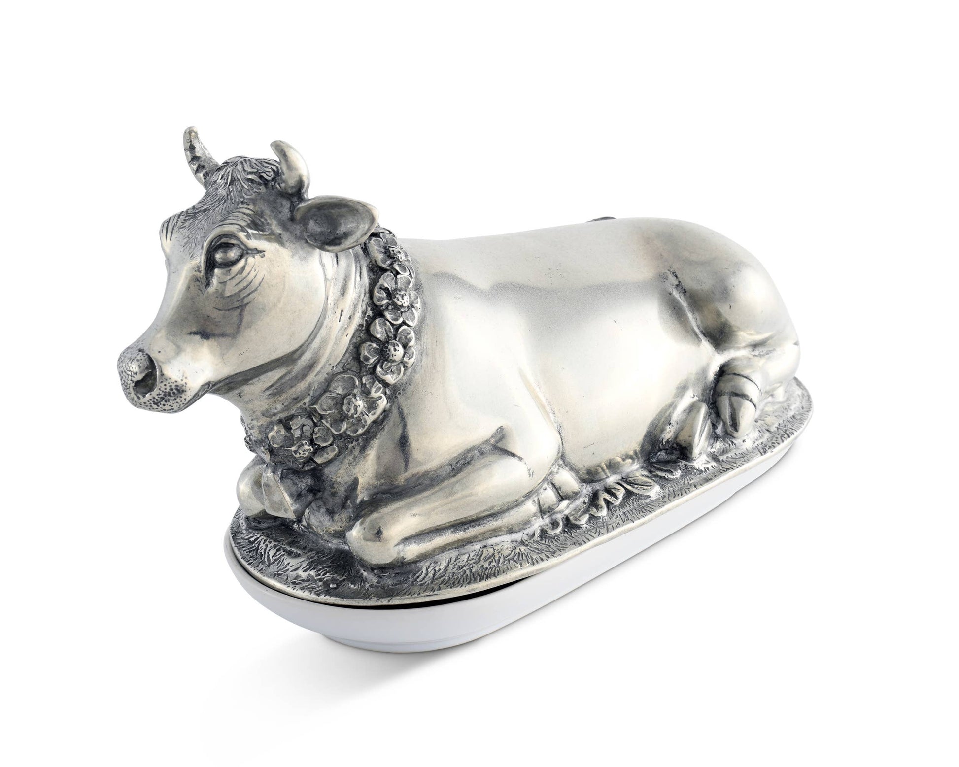 Mabel the cow wears beautiful garland of flowers and a cowbell. Realistically detailed in luxury-grade pewter, Mabel has a soft expression that brings calm to your table. Her legs and hooves curl up underneath her at the base of the lid, which covers the fine, replaceable stoneware butter plate. What better way to keep your butter fresh than with Vagabond House's darling cow, Mabel. Size: 8.5"L x 4"W x 4.75"H Care: Hand wash in warm water, use mild non-acidic soap. Rinse, dry completely. Dishwasher safe