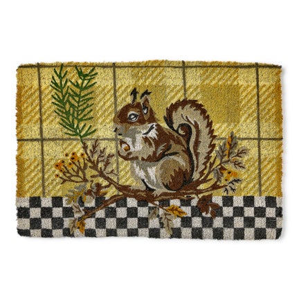 Elevate your entry with this Squirrel Entrance Mat. Crafted from durable coir fibers and features an cheeky squirrel perched on a delicate branch, atop a golden tartan background.